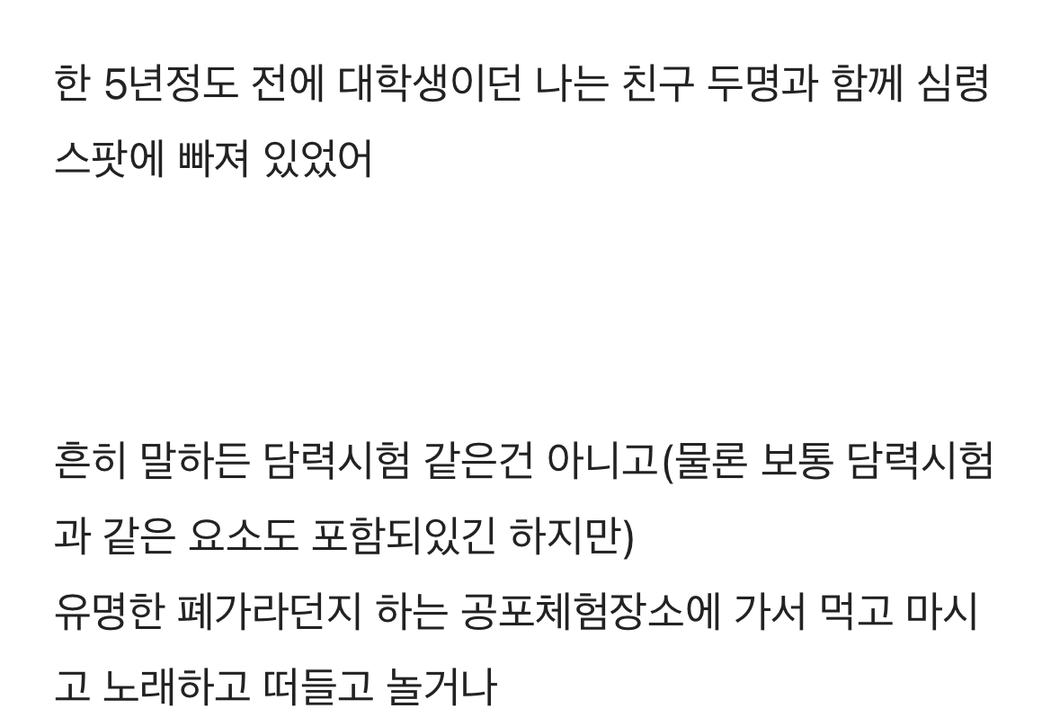유명한 폐가라던지 하는 공포체험장소에 가서 먹고 마시고 노래하고 떠들고 놀거나