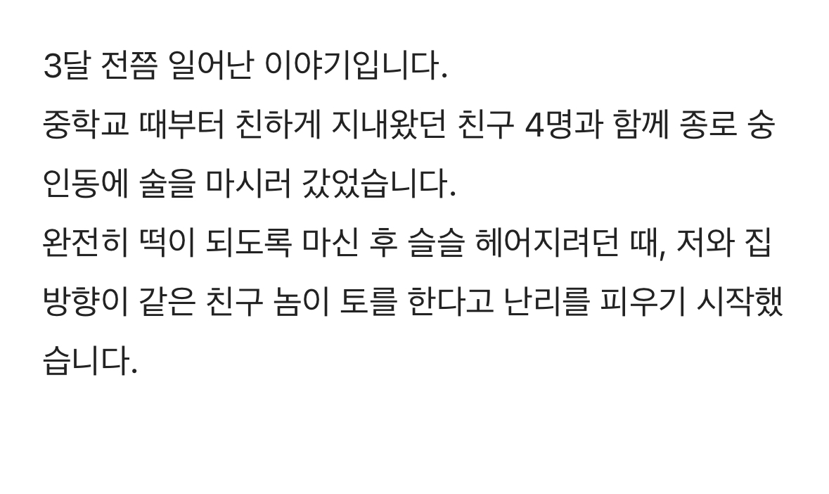 완전히 떡이 되도록 마신 후 슬슬 헤어지려던 때, 저와 집 방향이 같은 친구 놈이 토를 한다고 난리를 피우기 시작했습니다.
