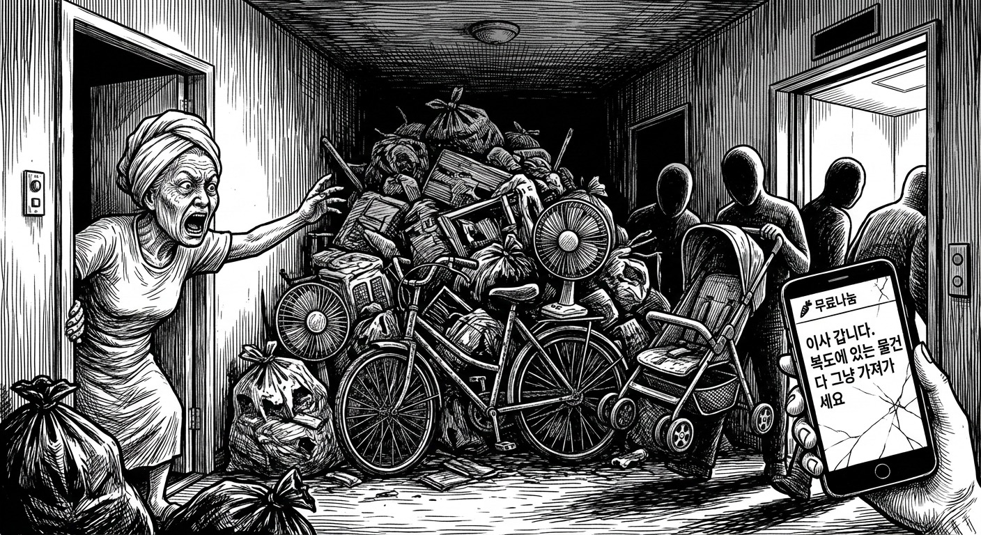 무료 나눔의 화력은 정말 대단하더라. 글 올린 지 5분도 안 돼서 채팅이 수십 개가 터졌고, 30분 정도 지나니까 하나둘 사람들이 우리 층으로 올라오기 시작했어. 밖에서 "어머, 이 유모차 진짜 가져가도 되는 건가?" "자전거 상태 괜찮은데?" 하는 소리가 들리더라. 나는 문틈으로 상황을 지켜봤지. 사람들이 하나둘 물건을 챙겨가기 시작했고, 특히 상태가 좋아 보였던 유모차랑 자전거는 순식간에 사라졌어.